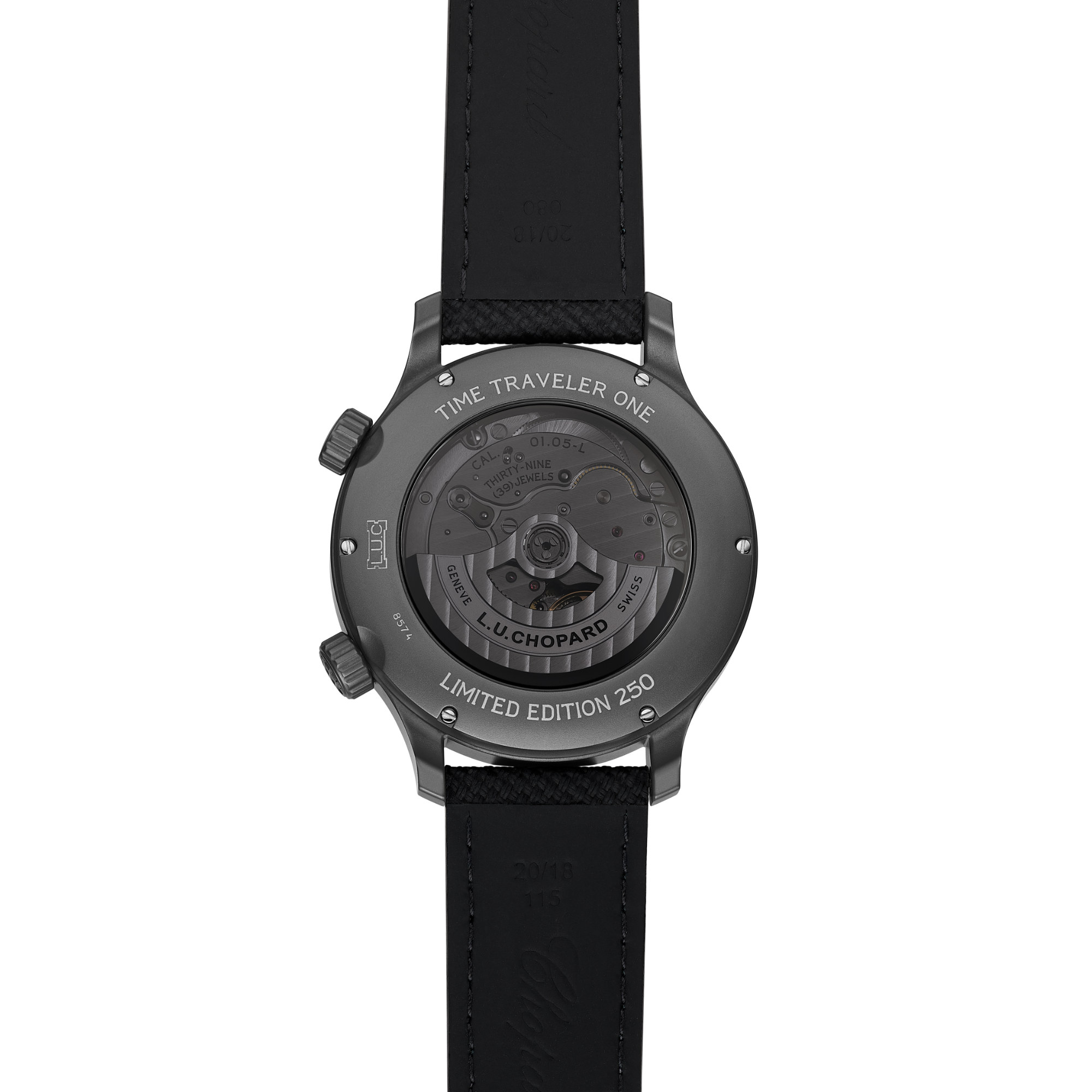 In einem durch Galvanisierung erreichten Schwarzton – von Hand gefertigtes, vertikales und satiniertes Finish in der Mitte – azurblauer Stundenkreis – weißes L.U.CHOPARD-Logo – arabische Ziffern und Indexe mit weißer Super-LumiNova-Beschichtung – Zeitscheibe für den Zielort in Hellgrau und Schwarz mit runder Satinierung – Anzeige der Zeitzonen in Dunkelgrau mit runder Satinierung