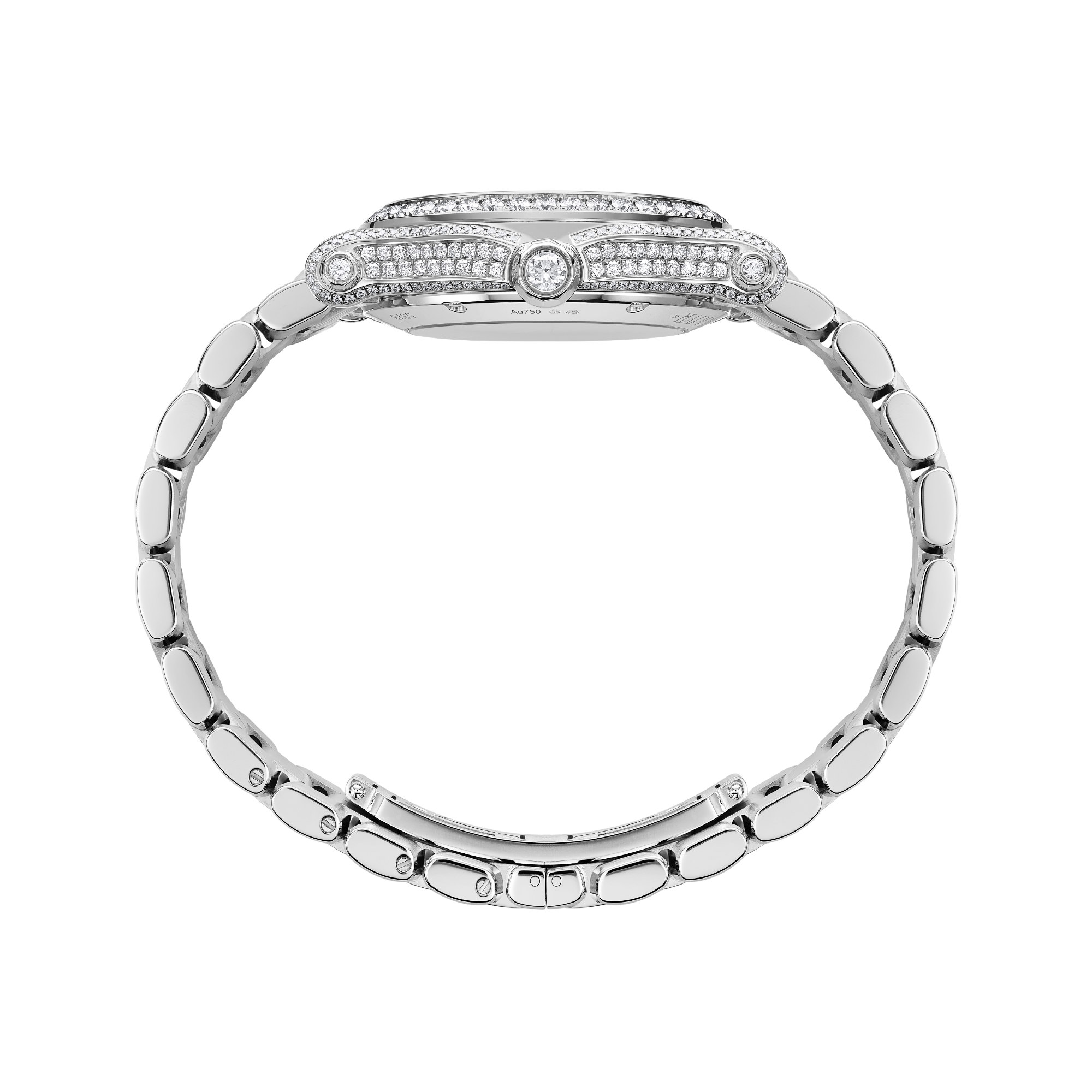Schimmerndes Perlmutt mit mittiger Guillochierung und Diamanten mit römischen Ziffern und Indizes