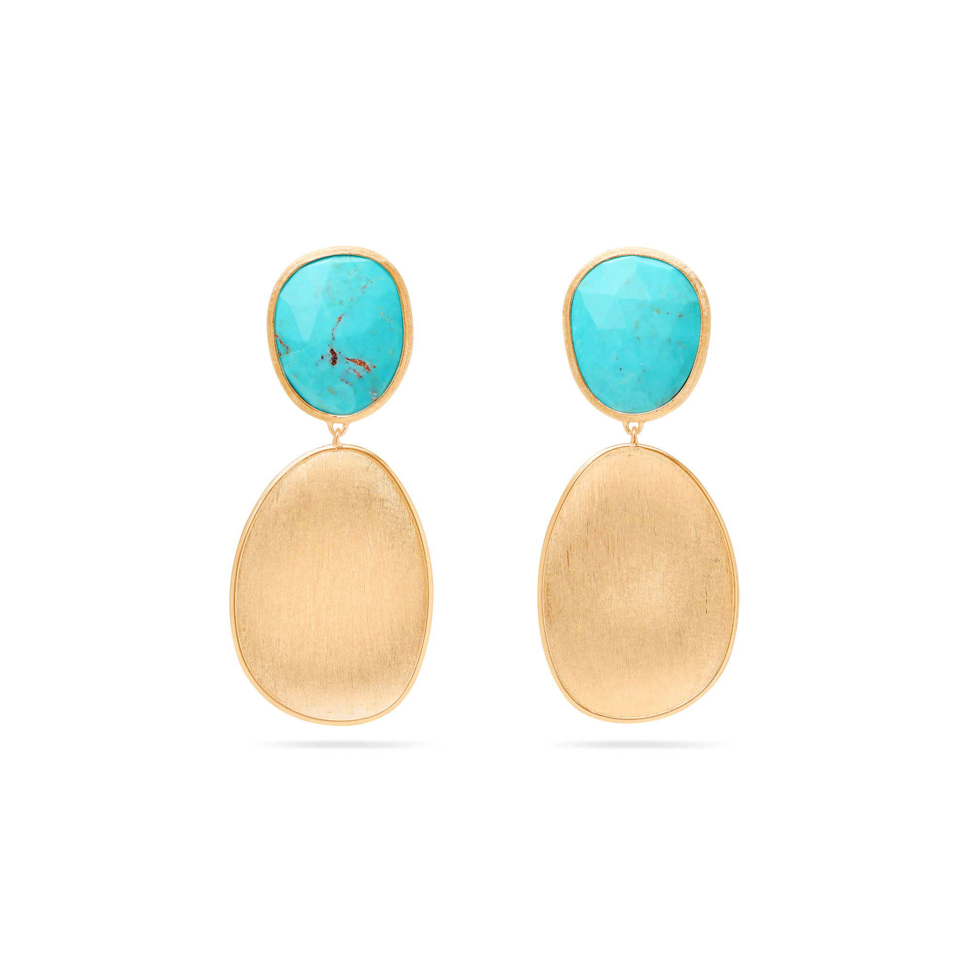 Ref. OB1345 TUM01 Y - Diese Hängeohrringe mit doppeltem Tropfen sind ideal für Stil, der auf dezente und doch wirkungsvolle Eleganz setzt. Die Blätter aus 18 Karat Gelbgold sind fein in einer antiken Technik mit dem Fadenstichel von Hand graviert, um eine zarte, unregelmäßige Satinierung zu erzielen. Zwei natürliche Türkise in Facettenschliff vollenden die Komposition. Ideal, um jedes Outfit mit einem farbigen Touch zu komplettieren.