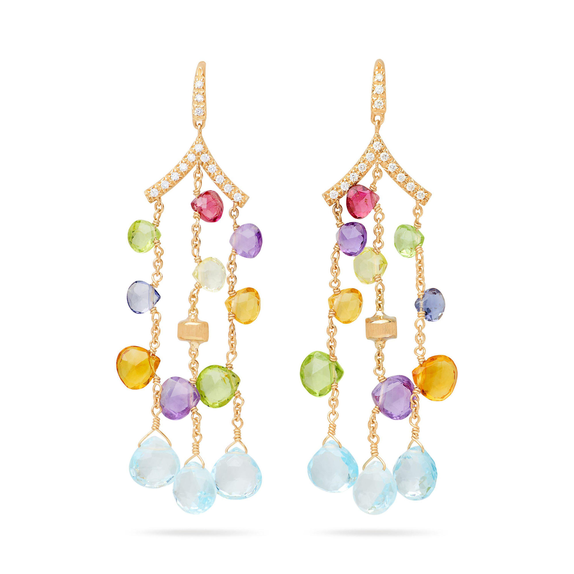 Ref. OB1845-AB MIX01T Y - Eine Kaskade aus Edelsteine im charakteristischen Herzschliff macht mit ihren vielfältigen diesen wunderschönen mehrreihigen Hängeohrring zum Eyecatcher. Der Haken aus Gelbgold mit 18 Karat ist mit einem Diamantpavé in Brillantschliff geschmückt.