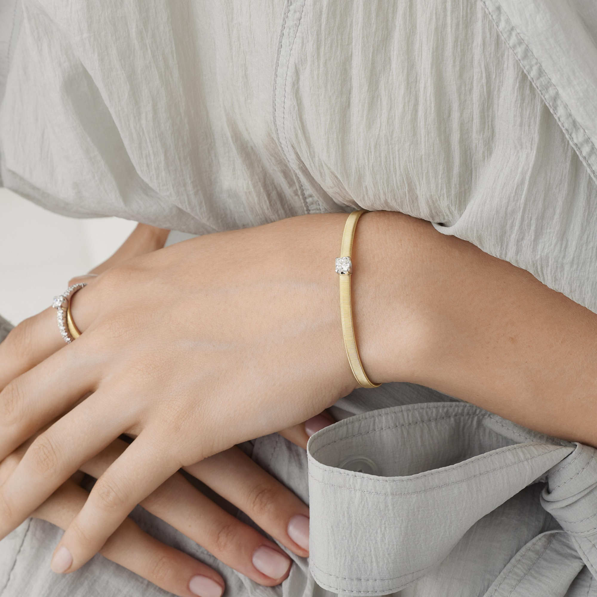 Ref. SG731 B4 YW - Dieser schlichte Armreif in linearem Design ist ein echter zeitloser Klassiker. Die Kreation ist aus Gelbgold mit 18 Karat mit der exklusiven handwerklichen Coil-Technik gefertigt und in der Mitte mit einem Diamanten in Kissenschliff mit 0,5 Karat veredelt. Der Armreif kann alleine getragen oder mit anderen Armbändern zu einem Stacking kombiniert werden, das als persönliches Stil-Statement das Handgelenk schmückt.