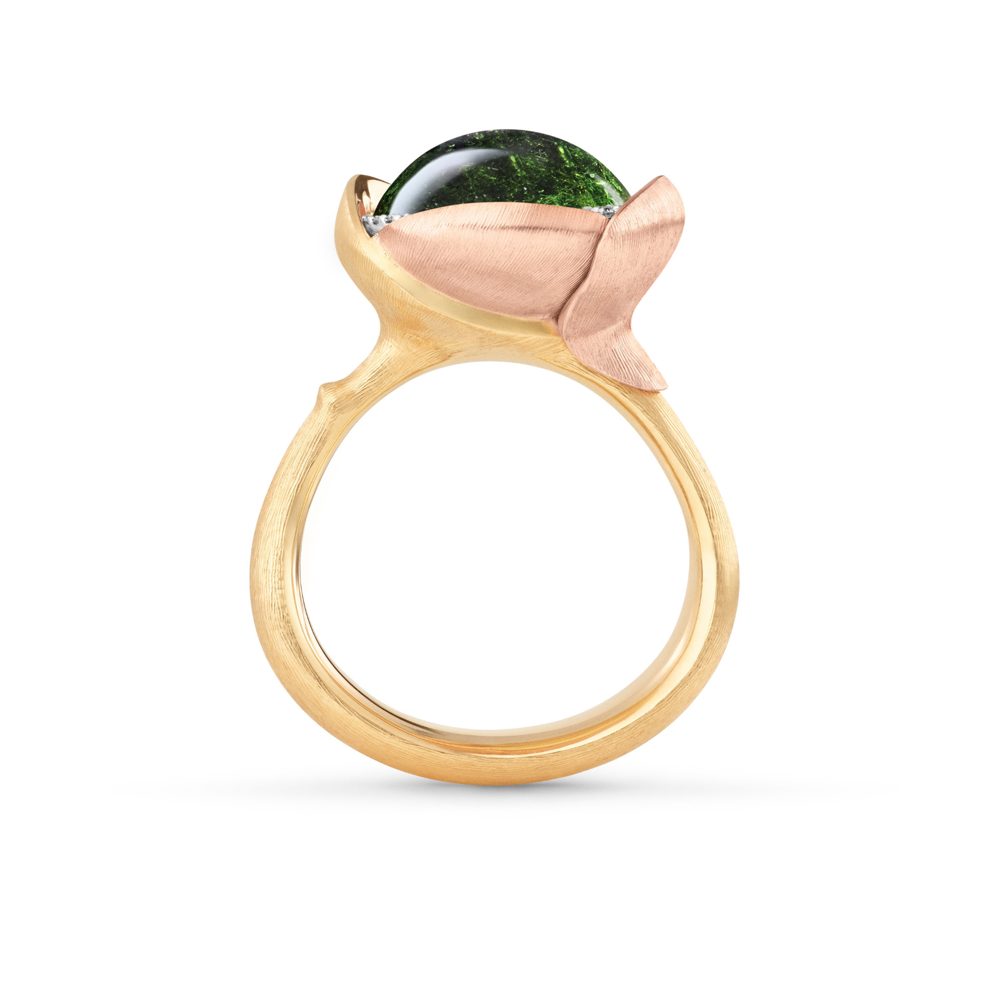 Ref. A2652-412 - Der von Charlotte Lynggaard entworfene Ring Lotus ist aus 18 Karat Gelb- und Roségold gefertigt und mit 13 Diamanten von insgesamt 0,05 carat TW. VS. und einem grünen Turmalin besetzt. In Handarbeit von Goldschmiedemeistern gefertigt, sind die sichtbaren Goldflächen hand-satiniert, während die Innenseite des Rings poliert ist. Teil der Lotus Kollektion. Bitte beachten Sie: Da Edelsteine natürliche Materialien sind, ist jeder Stein ein absolutes Unikat. Sie variieren in der Farbe und haben individuelle, einzigartige Einschlüsse und Merkmale. Web-Bilder von Steinen sind nur repräsentativ für den einzigartigen Stein, den Sie erhalten, wenn Sie das Produkt bestellen, nicht der exakte Stein.