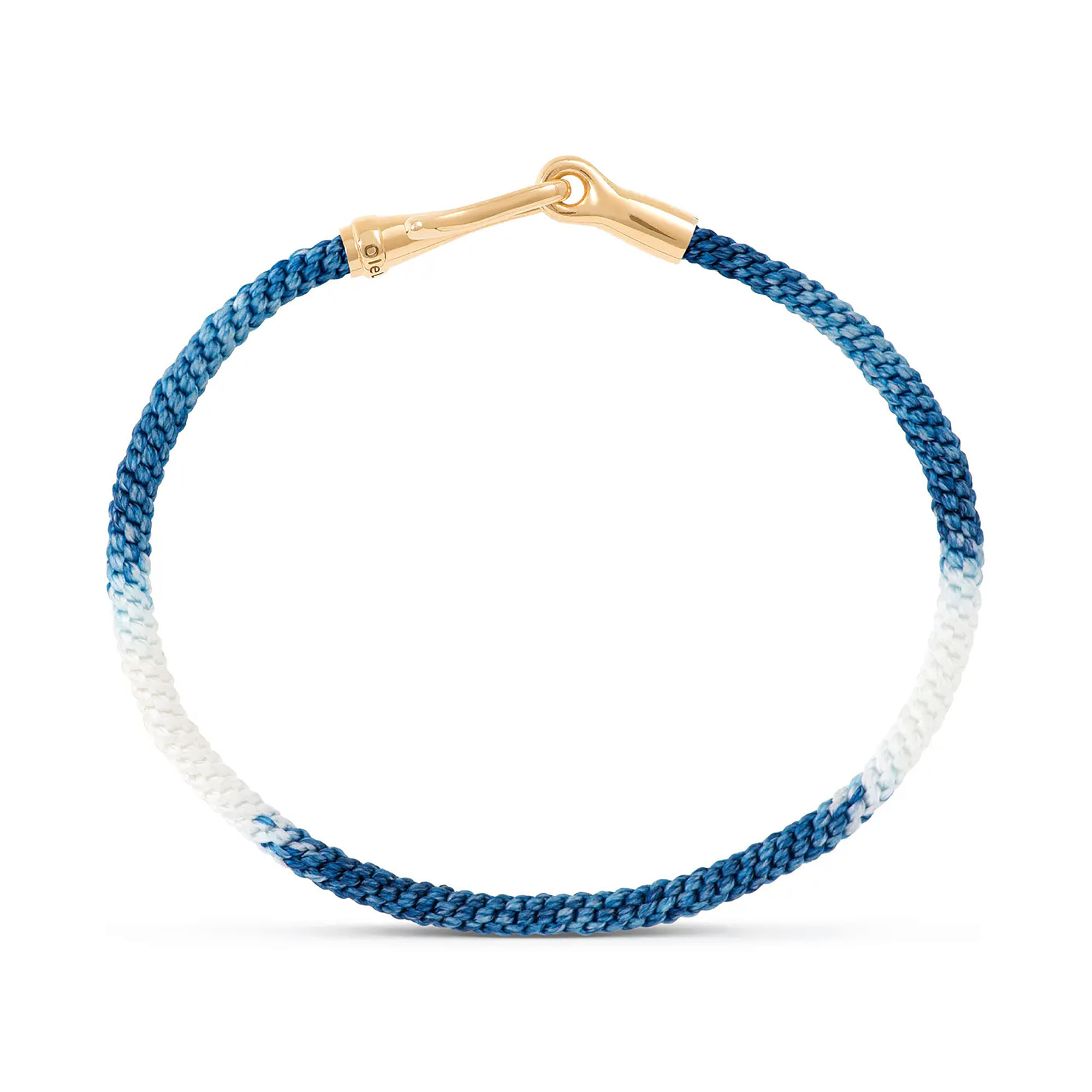 Ref. A3040-401 - Das von Charlotte Lynggaard entworfene Life Blue Jeans Armband ist handgeknüpft mit 8 Fäden, die jeweils aus 6 handgefärbten Fäden gewebt sind. Der markengeprägte Hakenverschluss wird von Goldschmiedemeistern aus 18 Karat gehärtetem und poliertem Gelbgold handgefertigt. Erhältlich in 15, 16, 17, 18, 19, 20 oder 21 cm. Teil der Life Collection.