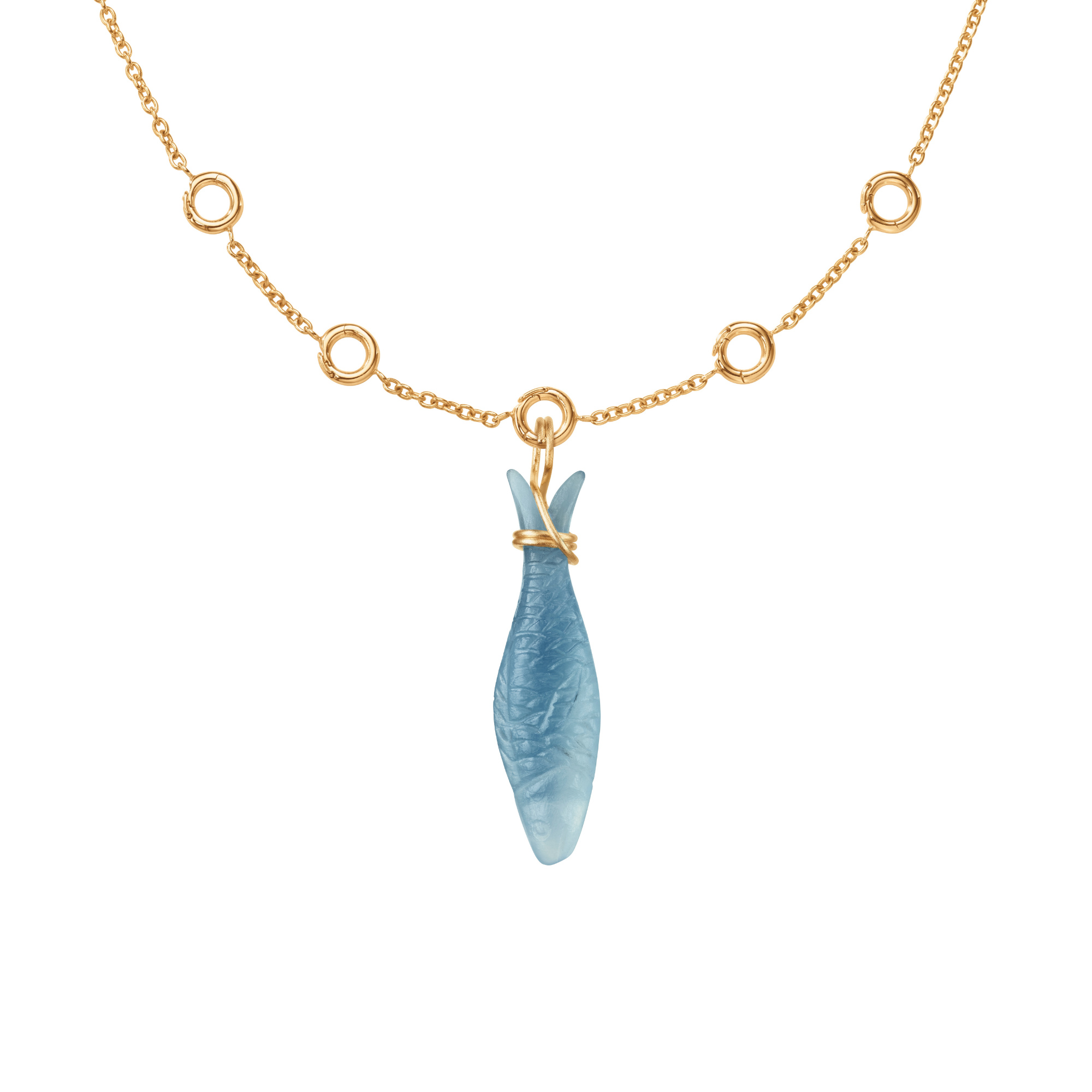 Ref. A3161-401 - Von Sofia Lynggaard Normann entworfen. Dieser Young Fish-Anhänger ist aus 18-karätigem Gelbgold gefertigt und mit einem individuell geschliffenen Aquamarin besetzt. Der Anhänger ist 3,5 cm lang. Wird als Einzelstück verkauft. Teil der Young Fish-Kollektion.