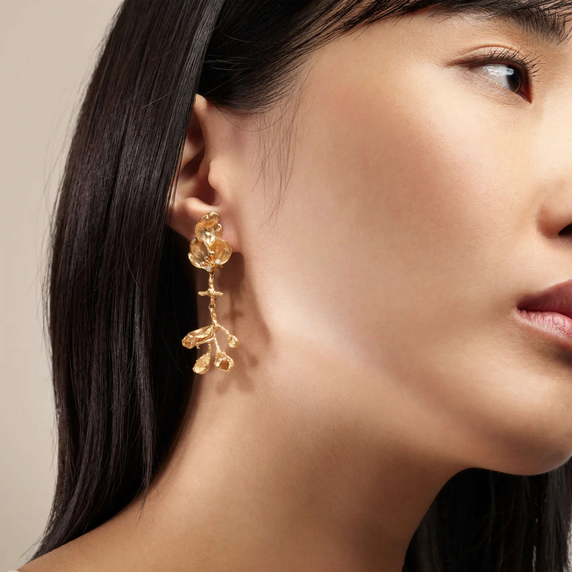 Ref. A3192-401 - Diese von Charlotte Lynggaard entworfenen Wild Rose-Ohrringanhänger sind aus 18-karätigem Gelbgold gefertigt. Goldschmiedemeister ritzen und hämmern die Goldoberflächen von Hand, um jedes Blumenwunder mit Leben zu erfüllen. Die Kanten sind poliert, um ihnen eine glatte Oberfläche zu verleihen. Diese Wild Rose-Ohrringe lassen sich mühelos mit anderen Stücken der Kollektion kombinieren, sodass sich ein Bouquet einzigartiger Ausdrucksformen eröffnet. Jeder Anhänger ist mit einem kleinen Haken versehen, mit dem er leicht an unterschiedlichen Ohrringen befestigt und wieder abgenommen werden kann. Als Paar verkauft. Teil der Wild Rose-Kollektion.