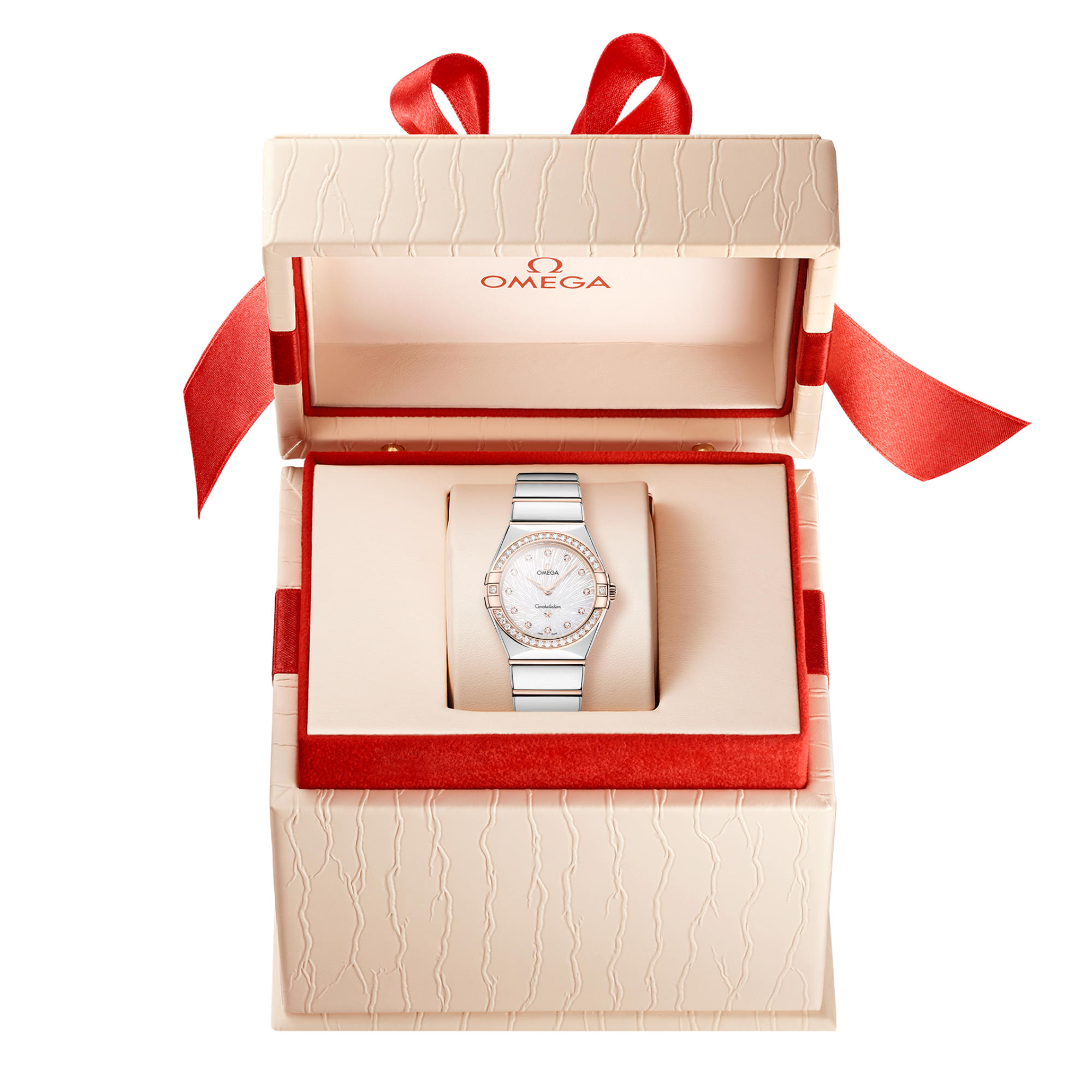 Die Zeiger, das OMEGA Logo, der Constellation-Stern und die Diamantfassungen sind ebenfalls aus 18 K Sedna™-Gold