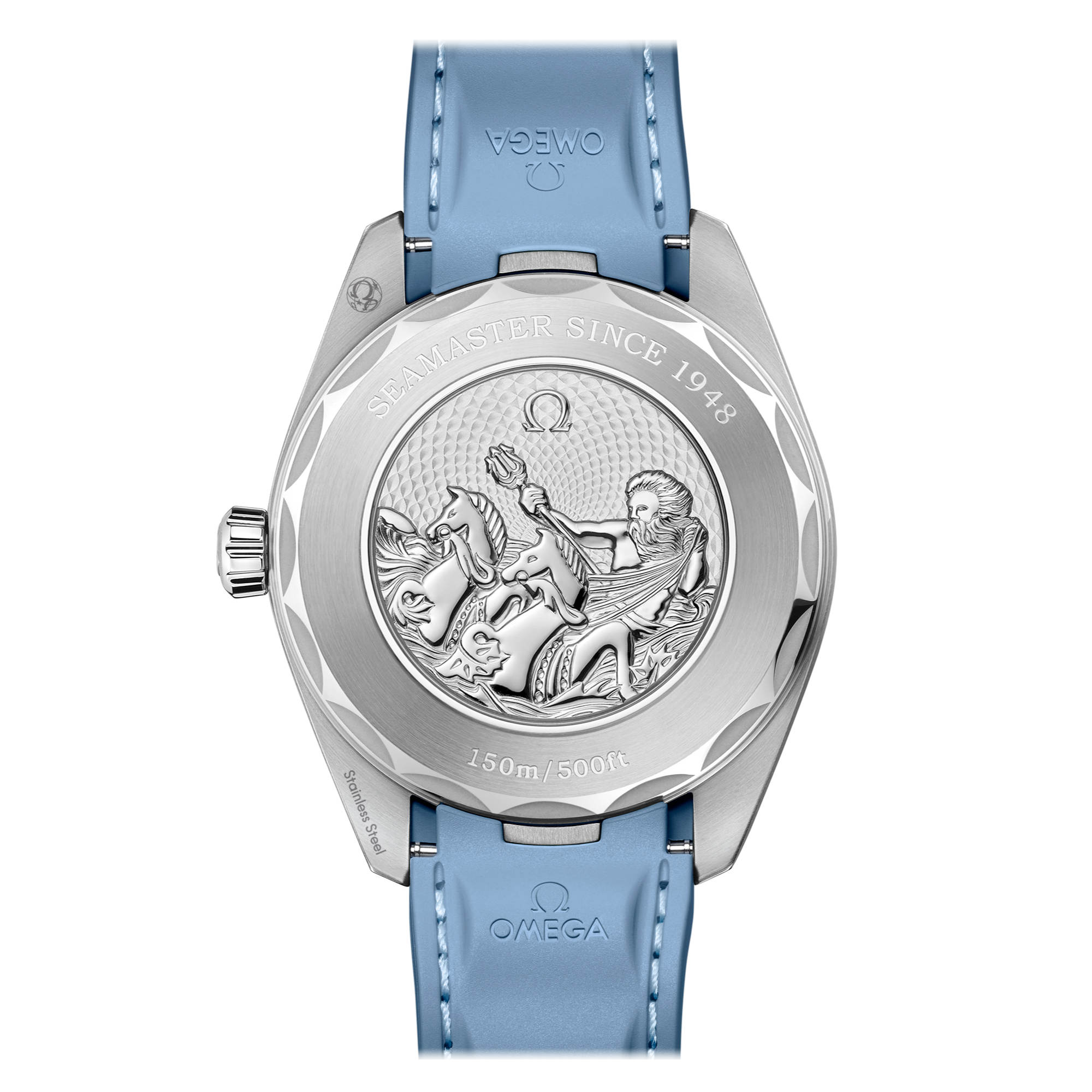 Auf der Rückseite der Uhr ist ein geprägtes Seamaster Gedenklogo zu sehen, das einen Poseidon mit Dreizack und zwei Seepferdchen zeigt: OMEGAs ursprüngliches Design von 1956 und aktuelles Markenemblem. Dahinter befindet sich das Co-Axial Master Chronometer Kaliber 8938.