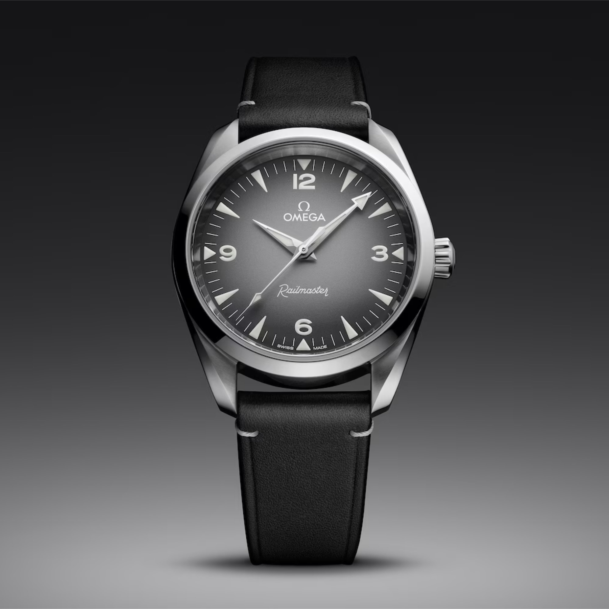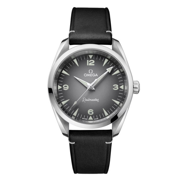 Das symmetrische 38-mm-Gehäuse ist gebürstet und poliert und wird von einem schwarzen Lederarmband am Handgelenk gehalten. In Anlehnung an die gut ablesbare Anzeige der Original Railmaster zeigt sich das Zifferblatt dieses Modells in Grau mit schwarzem Farbverlauf sowie mit großen Ziffern und Stundenindizes in weißer Super-LumiNova.