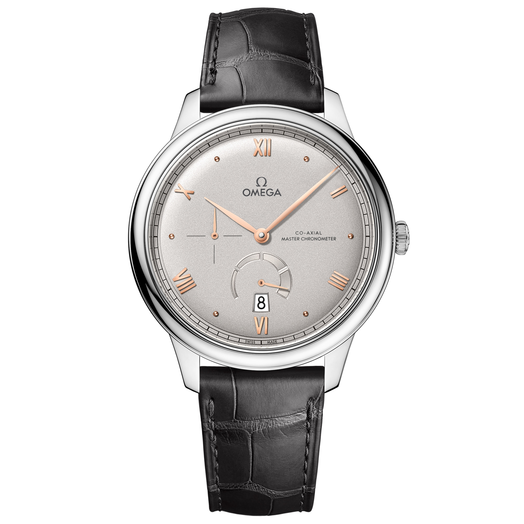 Uhrwerk mit Automatikaufzug und Co-Axial-Hemmung. Vom METAS Institut als Master Chronometer zertifiziert, unempfindlich gegenüber Magnetfeldern von bis zu 15.000 Gauß. Datums- und Gangreserveanzeigen bei 6 Uhr und kleine Sekunde bei 9 Uhr. Freie Unruh-Spiralfeder mit Spiralfeder aus Silizium, automatischer beidseitiger Aufzug. Rhodinierte Endverarbeitung mit Genfer-Streifen-Arabesken.