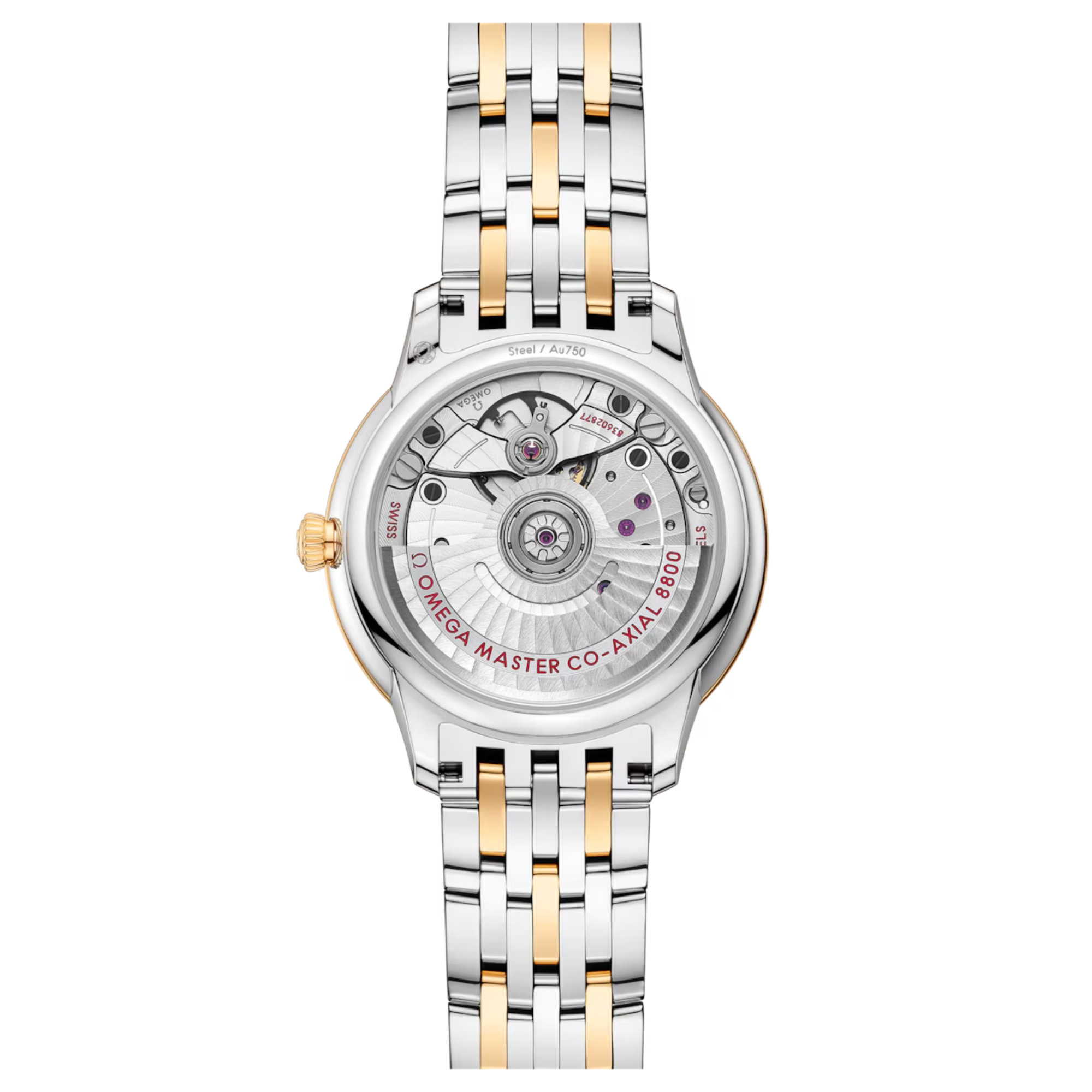Diese als Master Chronometer zertifizierte Uhr wird von einem Armband aus Edelstahl und Gelbgold am Handgelenk gehalten und von dem OMEGA Master Co-Axial Kaliber 8800 angetrieben, das durch den kratzfesten Saphirglasboden bewundert werden kann.