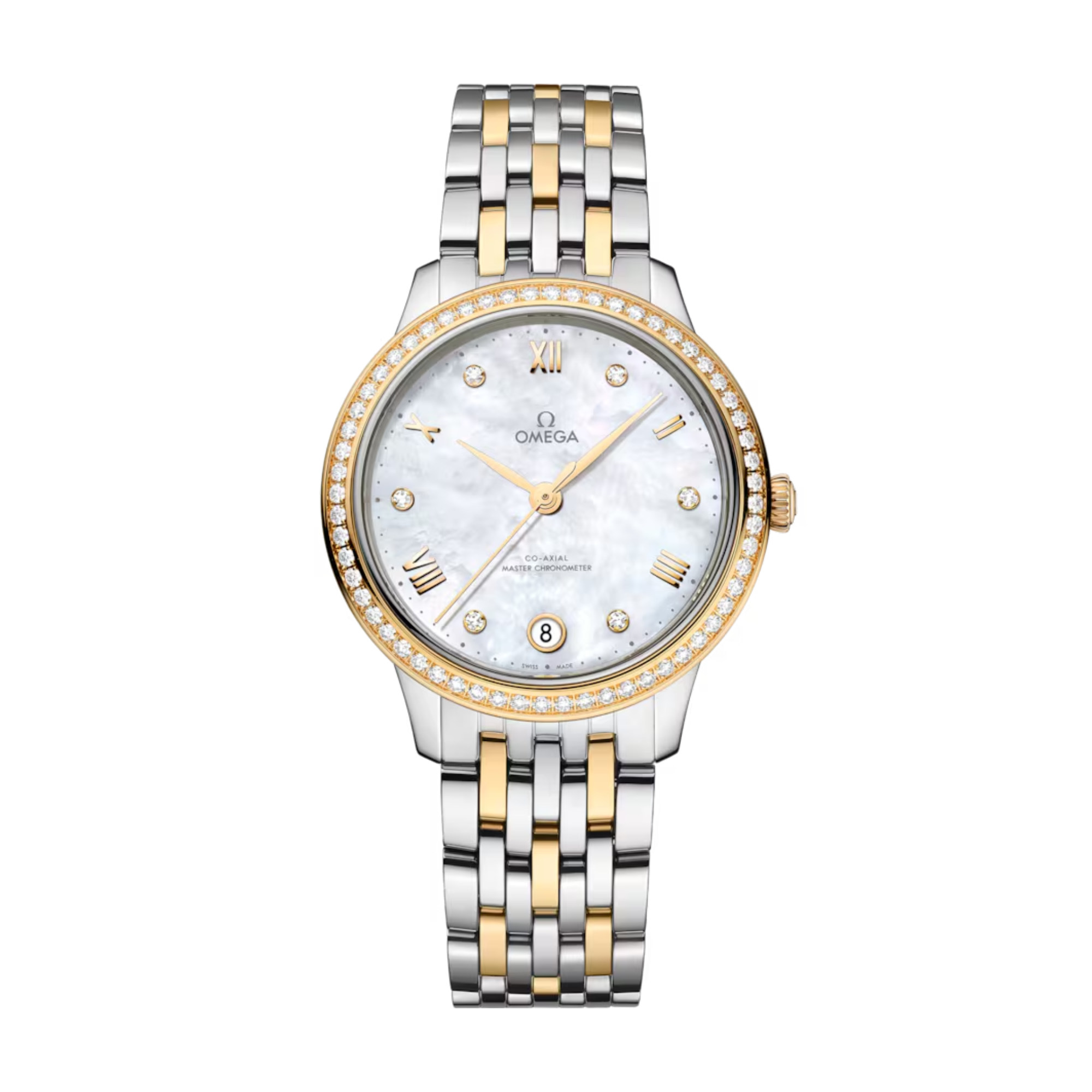 Ref. 434.25.34.20.55.002 - Dieses 34-mm-Modell aus Edelstahl und 18 K Gelbgold besitzt eine diamantbesetzte Lünette und ein Zifferblatt aus weißem Perlmutt. Die Anzeige zeichnet sich durch mit Gelbgold vergoldete Zeiger sowie alternierende römische Ziffern und Diamantindizes aus.
