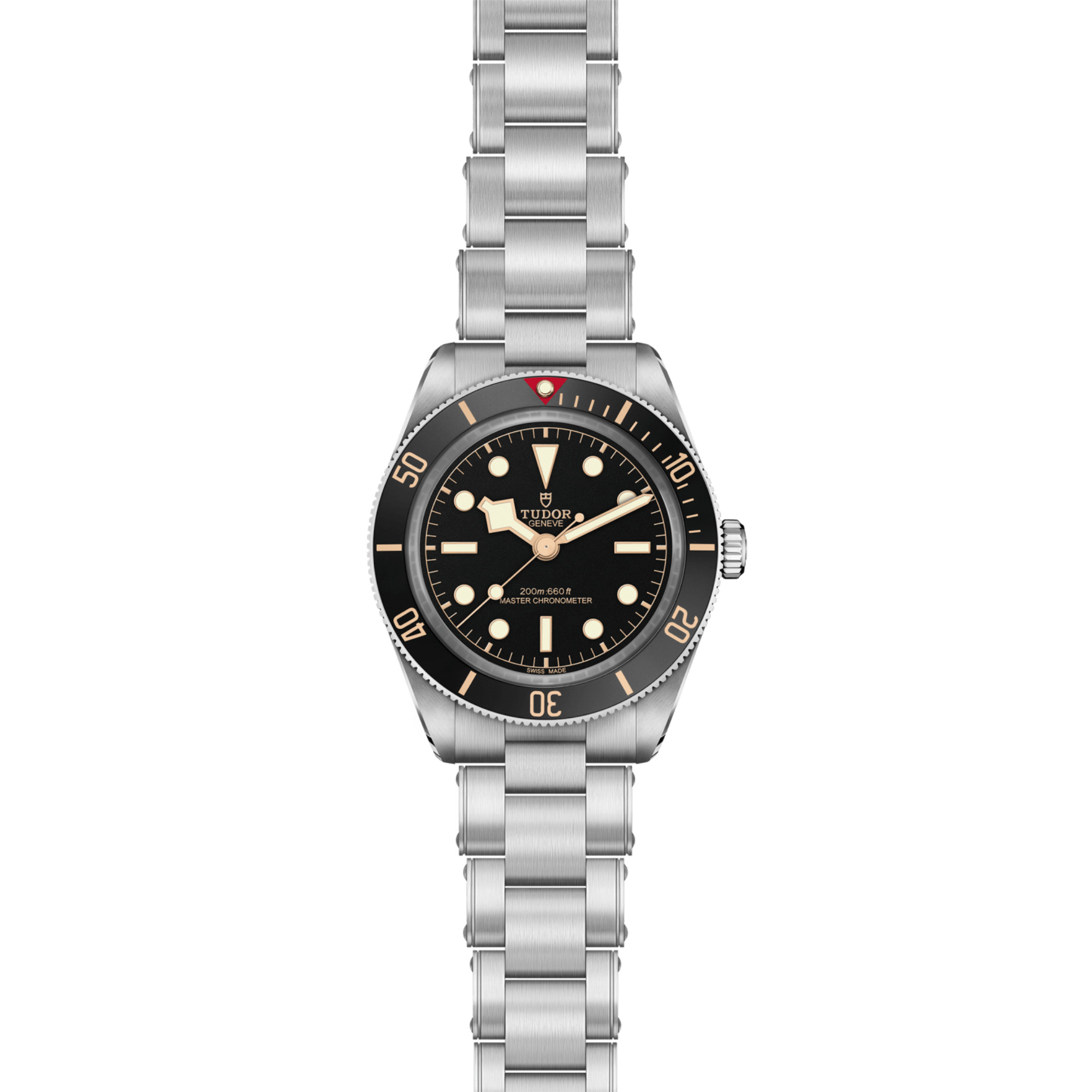 Ref. M7939A1A0NU-0002 - Diese Black Bay 58 ist mit einem drei- bzw. fünfreihigen Armband oder einem Kautschukband erhältlich. Alle drei Armbänder verfügen über das Schnellverstellsystem von TUDOR, die „T‑fit”‑Schließe. Somit besitzt das Modell nun einen höheren Tragekomfort als jemals zuvor und sogar ein Gehäuse mit neuer Form von 11,7 mm Höhe. Doch nicht nur das Gehäuse wurde neu gestaltet – auch die Ästhetik ist neu. Auf den ersten Blick ist leicht erkennbar, dass der Text auf dem Zifferblatt auf zwei Zeilen reduziert wurde, wie bei allen als Master Chronometer zertifizierten Modellen von TUDOR. Bei näherer Betrachtung stellt man zudem fest, dass die Zeiger nun am Ansatz schmaler sind und dass das Design der Lünette und der Aufzugskrone überarbeitet wurde.